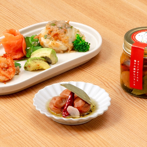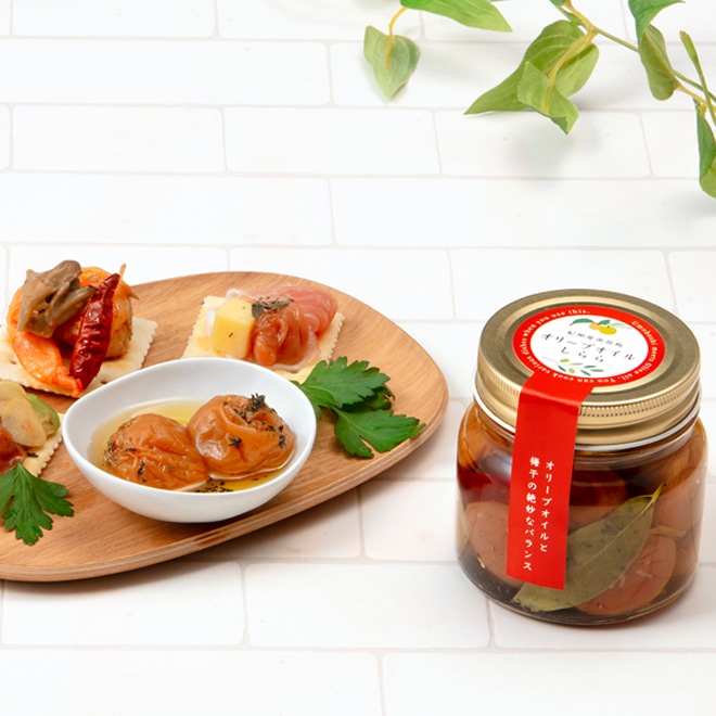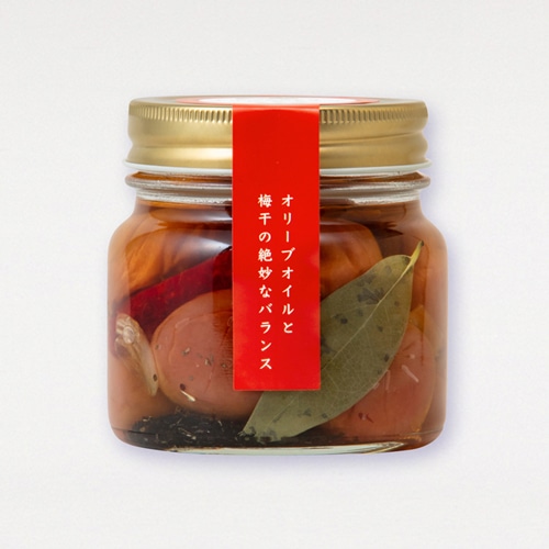 やさしい甘みの梅干し「しらら」をハーブやにんにくとともにオリーブオイルに漬け込みました。