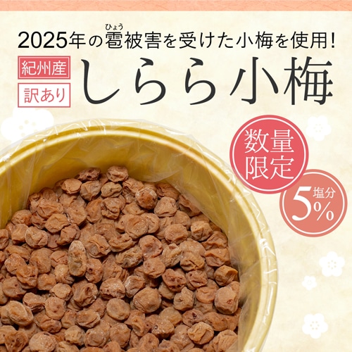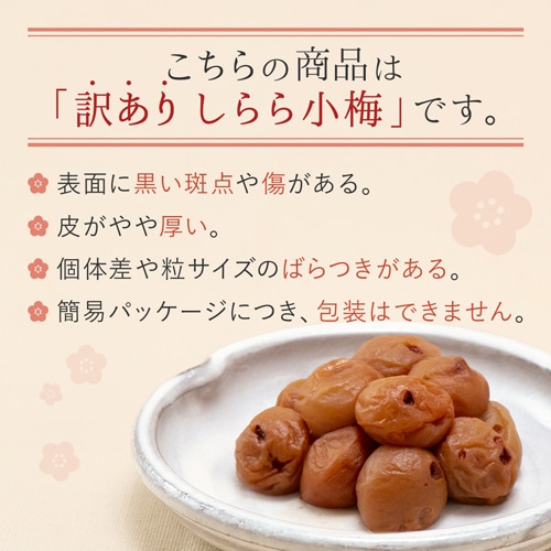 傷が付いてしまった紀州産小梅を、やさしい甘さで塩辛さを感じさせない味わいの「しらら小梅」に仕上げました。
